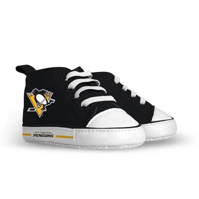 Introducing the newest addition to the Baby Fanatic line of officially licensed NHL Pittsburgh Penguins infant apparel and gear – Unisex High Top Pre-Walkers!The shoe features a soft fabric upper, ensuring a comfy fit for your little fan all day. The bottom grippers and padded soles make them perfect for those wobbly first steps, and a supportive toe cap that helps ensure stability and safety. The white elastic laces add a touch of style while making them easy to put on and take off. The Pittsburgh Penguins logo is printed along the sides facing out, ensuring that your little one will be looking sharp while rooting for their favorite team.