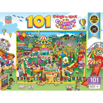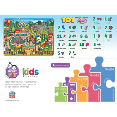Let the search begin with this 101 Things to Spot in the County fair puzzle. There are 101 fun and colorful things to spot in this county fair puzzle. Can you find them all? Good luck! This puzzle is 101 pieces and 19 inches x 14 inches in size. Look for The Right Fit® puzzles collection and make sure your little one gets the correct piece count and size for a good challenge for their age. This puzzle is the right fit for ages 6+.