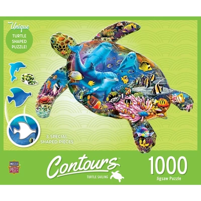 This 1000pc Sea Turtle shaped puzzle. Giant sea turtle swimming gently through the ocean in this shaped puzzle filled with all the amazing underwater color of an alive and active coral reef. Includes three special shaped pieces of sea life secure in the custom die. To reduce their impact on our environment, the chipboard used in these puzzles is made of recycled material.