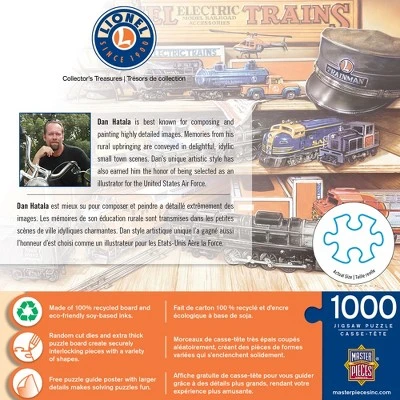 These MasterPieces Lionel Trains 19.25″ x 26.75″ 1000pc Puzzles are sure to become family favorites. Most collectible then ever before the Classic Lionel trains bring back fond memories of family times. Train collectors are sure to love the incredible details and accurate renditions of these American classics. To reduce their impact on our environment, the chipboard used in these puzzles is made of recycled material.