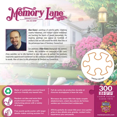This MasterPieces 18″ x 24″ Memory Lane 300PC EZ Grip Puzzle depicts A perfect picnic scene outside the barn on a summer day. It was painted by the talented Alan Giana, whose paintings of colorful paths, charming country hideaways, and tranquil coastal gateways are touching the hearts of people everywhere. Country living is at its best in this sublime home nestled against a lovely swan pond. Birds, butterflies, and dragonflies flit and swoop over the water as a single stately swan paddles across the pond. Pull up a porch chair and enjoy a peaceful evening in this colorful scene.The EZ-Grip technology used to make this puzzle offers larger puzzle pieces that snap together perfectly, without compromising image quality. To reduce its impact on our environment, the chipboard used in this puzzle is made of recycled material.