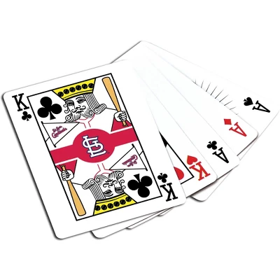 - 2 Decks of 3.5″ x 2.5″ Playing Cards with St. Louis Cardinals Logo and Team Designs on all Face Cards and Jokers