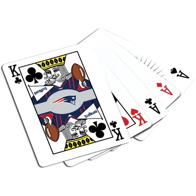 - 2 Decks of 3.5″ x 2.5″ Poker Size Playing Cards with New England Patriots Logo and Team Designs on all Face Cards and Jokers