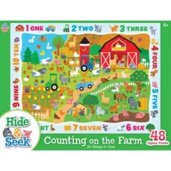 Let the search begin with this Hide & Seek: Counting on the Farm. There are 20 things to spot on this farm from animals to objects, each item corresponding with a number from 1-10. Can you find and count them all? This puzzle is 48 pieces and 19 inches x 14 inches in size. This puzzle is the right fit for ages 4+. Assists in building STEM and observational skills.