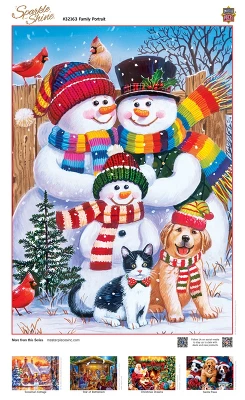 This MasterPieces 15″ x 21″ 500pc Holiday Glitter Puzzle is the perfect way to get into the holiday spirit, and the perfect Christmas present for friends and family. A family of snowmen make a pretty portrait. This beautiful work of art is enhanced with a glitter layer to give it an extra special touch. To reduce its impact on our environment, the chipboard used in this puzzle is made of recycled material.