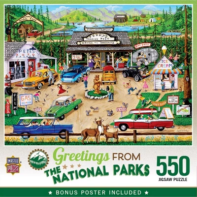 These MasterPieces 24″ x 18″ 550PC puzzle. Teddy’s Trading Post is the one-stop-shop for all the camping, fishing and adventuring needs just outside the entrance to the National park. Stop by for a snack after a long drive, or prep for the ride home with souvenirs and gas.To reduce their impact on our environment, the chipboard used in these puzzles is made of recycled material.