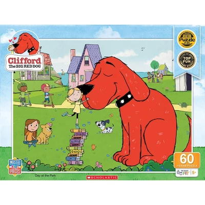 Clifford the Big Red Dog plays with friends in the town square. This puzzle is 60 pieces and 19 inches x 14 inches in size. Look for The Right Fit® puzzles collection and make sure your little one gets the correct piece count and size for a good challenge for their age. This puzzle is the right fit for ages 4+.