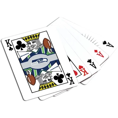 - 2 Decks of 3.5″ x 2.5″ Poker Size Playing Cards with Seattle Seahawks Logo and Team Designs on all Face Cards and Jokers