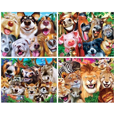 Put your skills to the test with this entertaining jigsaw puzzle 4-pack from MasterPieces! Includes (4) 100 piece puzzles featuring silly animal selfies. A fun challenge that makes for an amazing display piece once completed. Puzzles are a fun activity to do alone or in a group, and make a great gift for all ages at birthdays and holidays!