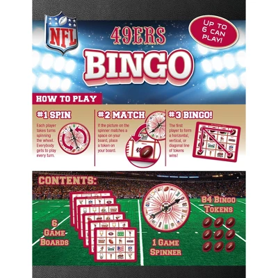 Play bingo with your favorite NFL Team! This San Francisco 49’ers Bingo Game puts a football spin on the family favorite. Many of the symbols represent your favorite NFL Team and other football memorabilia. Make all 9 matches and be the first to shout BINGO! This MasterPieces Bingo Game includes 1 spinner, 6 gameboards, and 84 custom tokens. Perfect for ages 3 and up.