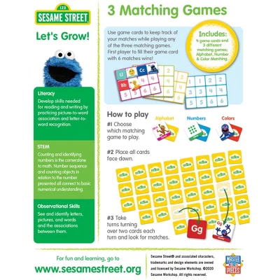 Enjoy family game night with this Sesame Street 3-in-1 Matching Game by MasterPieces. This game includes three sets of matching cards featuring different educational themes. Alphabet Matching with 26 matching pairs, Number Matching with 20 matching pairs, and Color Matching with 22 matching pairs. Matching cards feature Sesame Street furriest, silliest Muppet friends. Game comes with 4 game boards featuring 6 matching spots each to keep track of matches. Allows for shorter game play with only 6 matches for the younger ages. Challenge your memory and have fun trying to find the pairs. Play with the game boards or with a traditional game play and collect the most matches by the end of the game to win!For 1+ players, ages 3+.