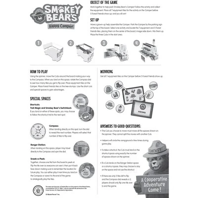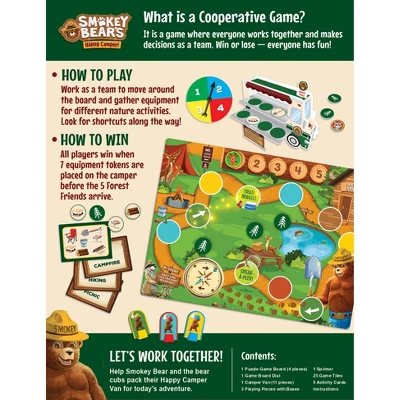 Let’s work together with Smokey Bear’s Happy Camper Cooperative Game by MasterPieces. Help Smokey Bear and the cubs pack their van for today’s adventure. Choose between 5 activity cards and collect the equipment before your Forest Friends arrive! Includes Game Board with dial, Camper Van, Spinner, 3 Playing Pieces, 25 tokens, 5 cards, and Rules. For 2-4 players, ages 4+.