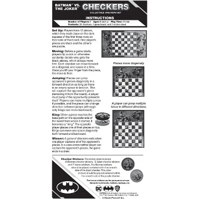 Looking for a fun game to play with your family and friends? Look no further than the Batman vs. Joker Checkers Board Game! This classic game of checkers comes with 12 black and 12 purple checkers pieces, a 13″ x 21.375″ Batman game board, 1 sticker sheet with bonus stickers, and instructions. For 2 players, children and adults ages 6+, this checkers game is perfect for any fan of Batman. So put on your cape and mask and get ready to play!