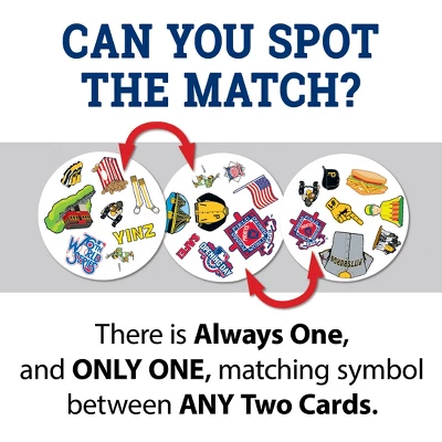 Spot It! Officially licensed MLB Pittsburgh Pirates Edition puts an exciting spin on the family favorite. Just like the other Spot It! games, this Pittsburgh Pirates Edition comes with a variety of unique symbols for you to identify and match from card to card. Many of the symbols represent the Pittsburgh Pirates and the league. Play it once or play all night, with 55 unique cards and five different mini-games, you’ll catch yourself going into extra innings with Spot It! Pittsburgh Pirates Edition. Games take approximately 5 to 10 min to complete and is perfect for children and adults ages 7 and up.