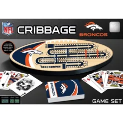 Looking for something fun and challenging to do while cheering on your Denver Broncos? Look no further than this MasterPieces officially licensed NFL Denver Broncos Cribbage Game Set for adults and families! This set includes a durable wood-finished cribbage game board, shaped like a football, with authentic Denver Broncos logos. Peg your way around the board with Yardage Marker Pegs, and make runs with hand-drawn Kings, Queens, and Jacks dressed in team gear. This Cribbage Game Set is perfect for the ultimate fan of the Denver Broncos and Cribbage.
