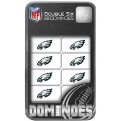 Officially licensed, MasterPieces NFL Philadelphia Eagles dominoes are perfect for any sports fan! This Double-Sixes Philadelphia Eagles Dominoes Set comes in a collectible tin box and includes 28 resin dominoes with a team logo printed on the back of each one. Dominoes Instructions are also included. This Sports Dominoes Set is perfect for all sports fans, ages 6 and up! Bring a little bit of pride home with you by purchasing this unique Dominoes Set!