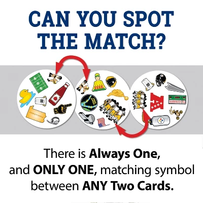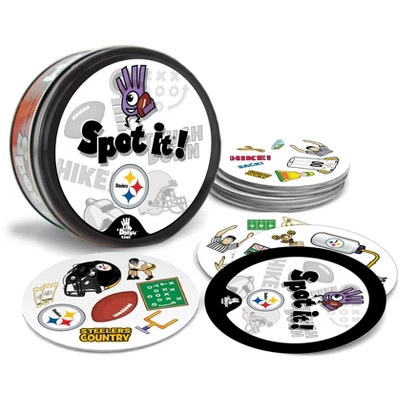 Spot It! Officially licensed NFL Pittsburgh Steelers Edition puts an exciting spin on the family favorite. Just like the other Spot It! games, this Pittsburgh Steelers Edition comes with a variety of unique symbols for you to identify and match from card to card. Many of the symbols represent the Pittsburgh Steelers and the league. Play it once or play all night, with 55 unique cards and five different mini-games, you’ll catch yourself going into extra innings with Spot It! Pittsburgh Steelers Edition. Games take approximately 5 to 10 min to complete and is perfect for children and adults ages 7 and up.