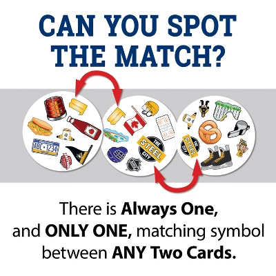 Spot It! Officially licensed NHL Pittsburgh Penguins Edition puts an exciting spin on the family favorite. Just like the other Spot It! games, this Pittsburgh Penguins Edition comes with a variety of unique symbols for you to identify and match from card to card. Many of the symbols represent the Pittsburgh Penguins and the league. Play it once or play all night, with 55 unique cards and five different mini-games, you’ll catch yourself going into extra innings with Spot It! Pittsburgh Penguins Edition. Games take approximately 5 to 10 min to complete and is perfect for children and adults ages 7 and up.